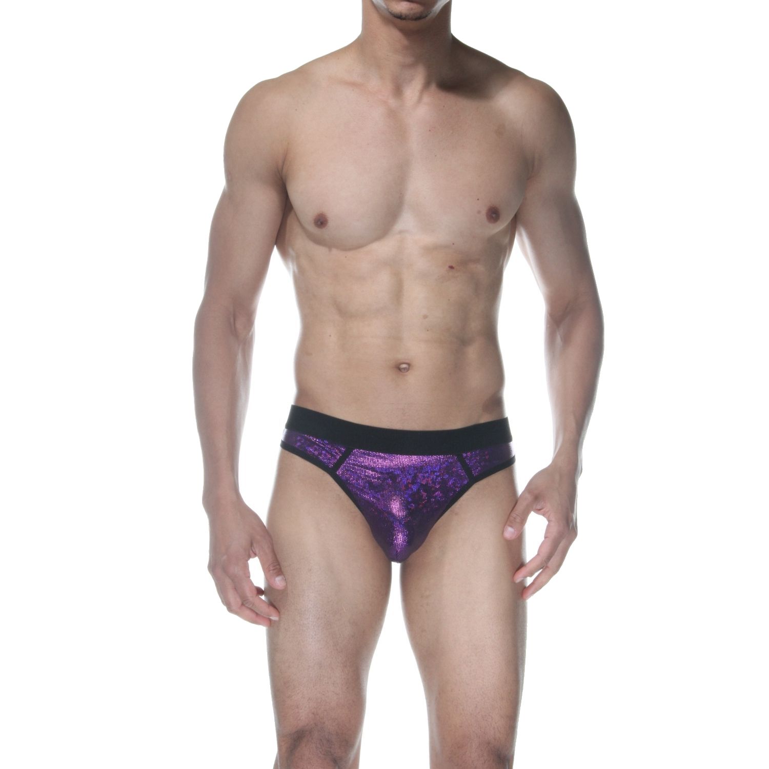 Фиолетовые блестящие мужские трусы-стринги.