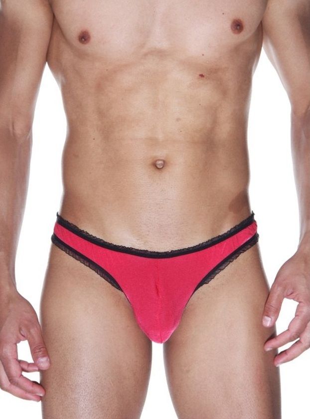 Красные мужские трусы-бразилиана с черной рюшевой отделкой.