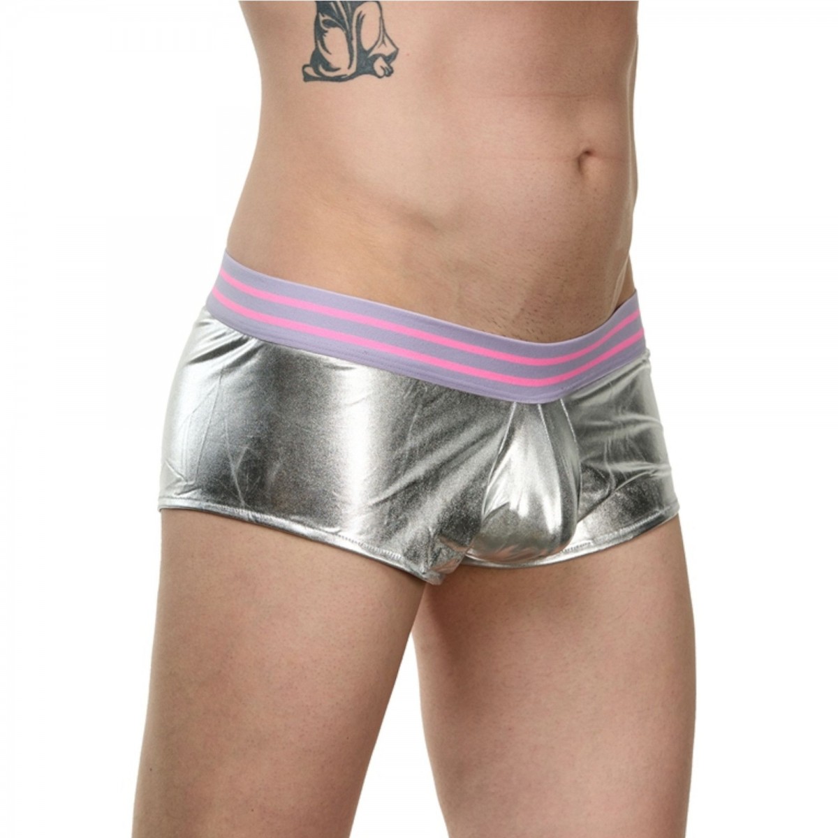 Мужские серебристые трусы-боксеры с широкой резинкой в полоску.
