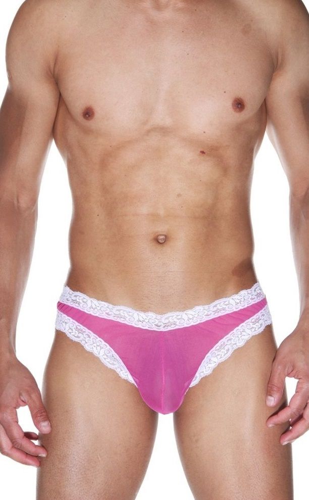 Мужские бразилиана цвета фуксия из полупрозрачного легкого тянущегося материала. Кант из кружевной белой ленты.