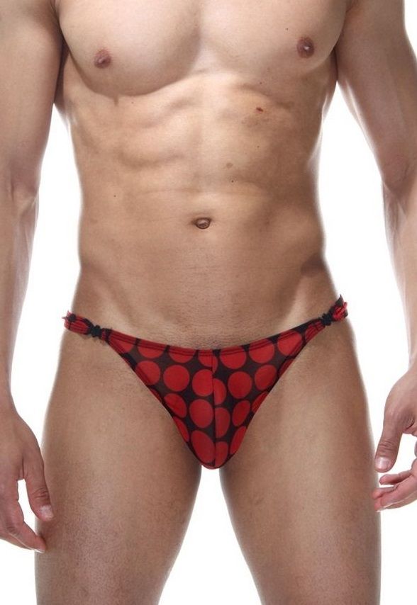Тонги из легкой тянущейся ткани в крупный красный горох. Тонги с низкой посадкой, имеют две пластиковые застежки по бокам.