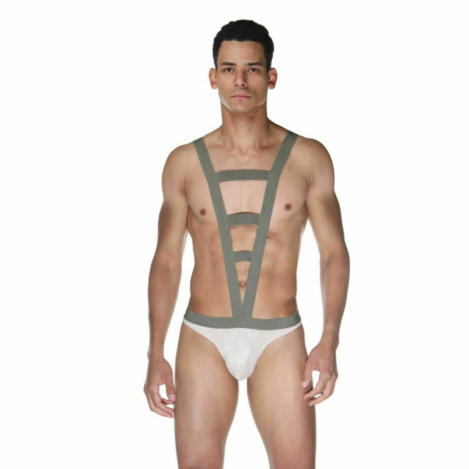 Оригинальное боди с трусами-джоки для мужчин. Трусы белого цвета из тонкой эластичной ткани, а верхняя часть боди и зад выполнены из серых широких тянущихся ремней.