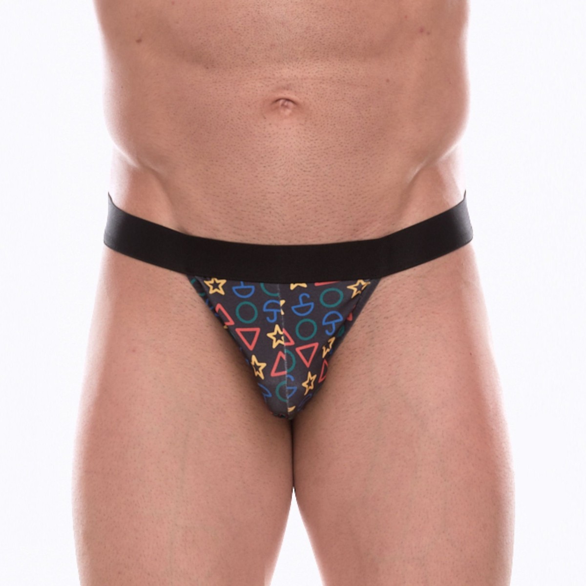 Темно-серые трусы-танга с разноцветным принтом в виде значков.