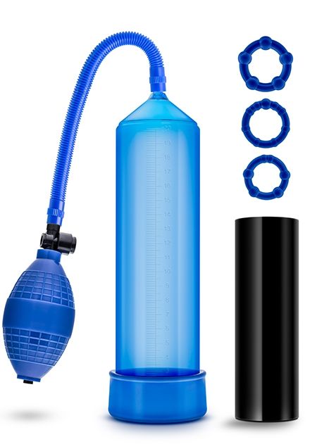 Ввакуумный массажер для мужчин. Создает хорошую степень разряжения в колбе за счет удобного ручного механизма выкачивания воздуха. В комплект входят 3 эрекционных кольца разного диаметра для увеличения притока крови в момент вакуумного массажа, а также мастурбатор. Длина помпы - 24 см., рабочая длина - 20 см., диаметр - 5,7 см. Длина мастурбатора - 14 см. Диаметр колец - 3,1, 3,3 и 3,8 см.