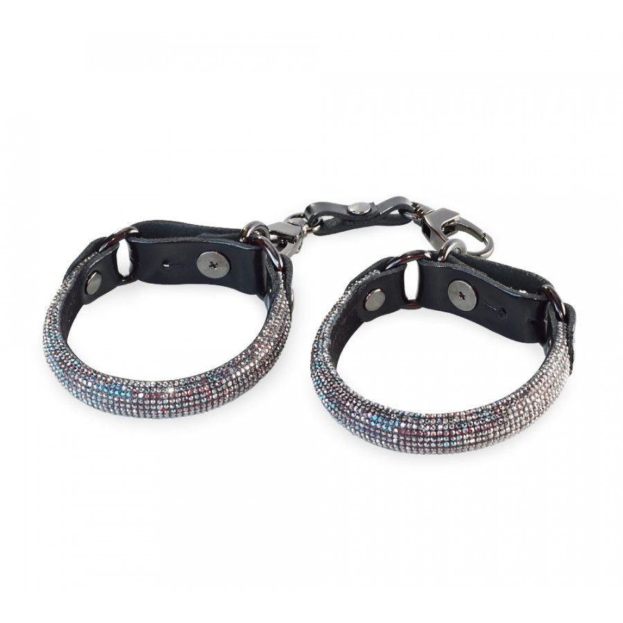 Сверкающие наручники украсят Ваше тело, добавят в Ваш образ шика и особой сексуальности. Внутренняя сторона наручников велюровая, лицевая - усеяна множеством сверкающих кристаллов. Застегиваются при помощи лакового ремешка и кобурной кнопки. В комплекте с наручниками идет перемычка с двумя карабинами. Девайс можно использовать как браслет. Обхват запястья - 19-20 см.